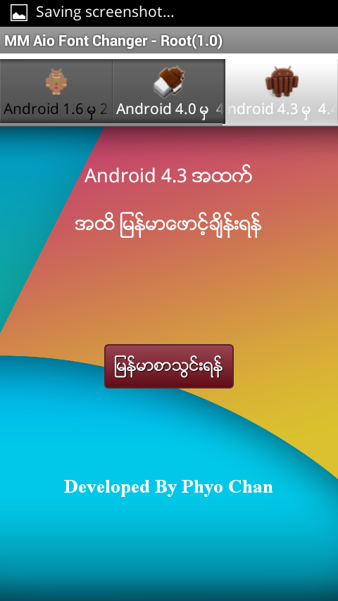 (Android Version 1.6 မွ 4.4.2 အထိ Support ေပးေသာ Font Changer) MM Aio Font Changer ကေတာ့ Android Version 1.6 ကေန 4.4.2 အထိ အလုပ္လုပ္ပါတယ္။ မိမိဖုန္းကုိ Root လုပ္ထားရုံနဲ႕ ေဇာ္ဂ်ီ ၊ Smart ေဇာ္ဂ်ီ တုိ႕ကုိ ၾကိဳက္ႏွစ္သက္ရာ ေရြးခ်ယ္သုံးႏုိင္ပါတယ္။